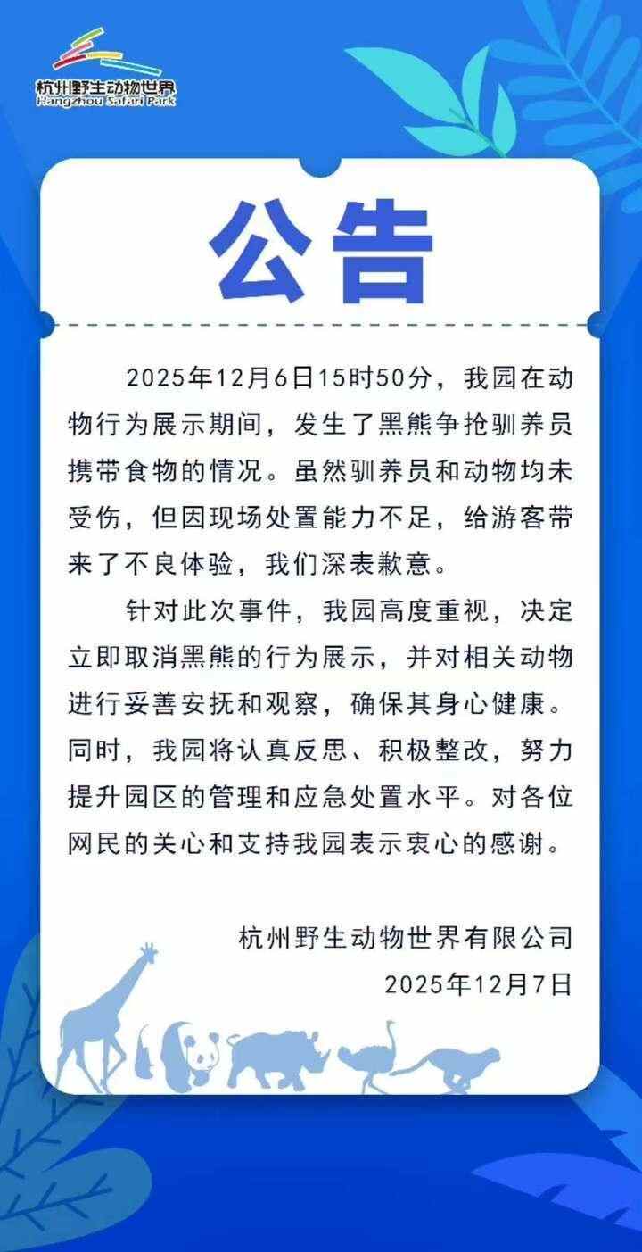 12月6日,坐落杭州市富阳区的杭州野生动物国际在进行黑熊展现扮演时发生了黑熊将驯养员扑倒争抢食物然后让观众受惊的事情。次日,动物园方面回应记者称,该扮演节目暂停。接着,动物园官方发布通报称,决议当即撤销黑熊的行为展现并将认真反思和活跃整改,但该通报未标明黑熊扮演的节目今后是否会康复。